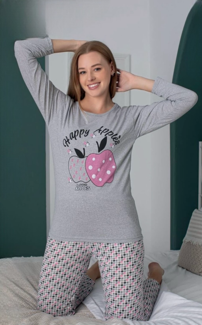 Γυναικεία μακρυμανικη ανοιξιάτικη/φθινοπωρινή πιτζάμα το παντελόνι είναι σε ίσια γραμμή.